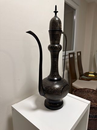 Elegante jarra de estilo marroquí con un diseño intrincado. - Acabado en negro y dorado. - Fabricada en metal. - Detalle de grabados florales.