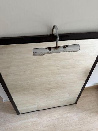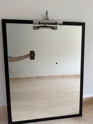 Espejo con marco negro, 70x90. Tiene para toma de luz pero se puede eliminar y usar como espejo en cualquier lugar.