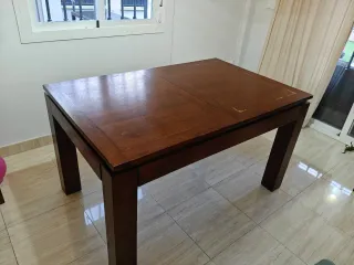 Mesa de comedor extensible de madera maciza. Sus dimensiones originales son 140x90 cm, ideal para espacios de tamaño medio. Ampliable a 190cm. La altura de la mesa es de 79cm. - Diseño robusto y elegante. - Acabado en tono marrón oscuro. Tiene marcas de uso como se ven en las fotos