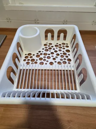 Práctico escurreplatos de plástico blanco, ideal para organizar la vajilla. - Diseño con múltiples orificios para un secado eficiente. - Bandeja inferior para recoger el agua. - Compartimento adicional para cubiertos o utensilios pequeños.