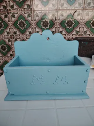Especiero de madera pintado en color azul claro. Presenta un diseño decorativo con puntos en relieve. A la tapa le falta colocar las visagras, las adjunto. - Color: Azul claro - Material: Madera - Diseño: Puntos en relieve