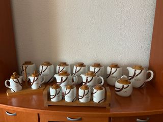 Conjunto de aceitera y especieros con un diseño original de Perú. - Piezas de cerámica con detalles pintados a mano por personas del Machupichu. - Incluye dos jarras pequeñas y dos recipientes con tapa. - Base redonda decorada para presentar el conjunto. Está sin estrenar completamente nuevo. Precio a convenir.