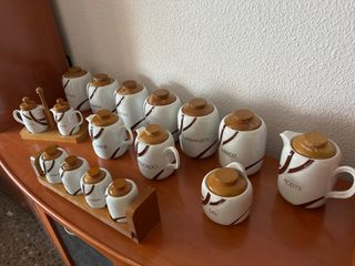 Precioso juego de especiero vintage de la marca T&B. Ideal para amantes de lo retro. - El juego incluye 16 piezas de porcelana y madera. - Diseño elegante en blanco y marrón. - Perfecto estado de conservación. Lo único es que de estar en la caja, alguna tapita de madera se le está yendo el lacado, por lo demás está sin estrenar