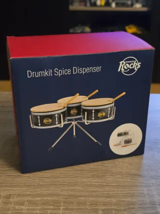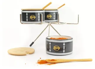 Original especiero con diseño de tambor de batería. - Base con tres soportes. - Tapas de madera. Nuevo sin estrenar