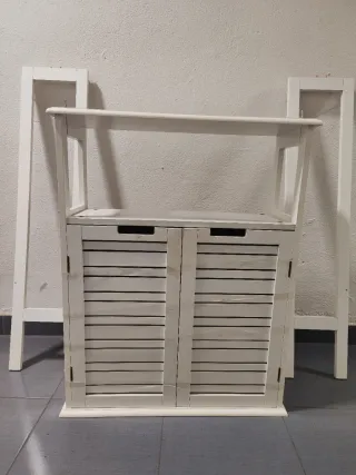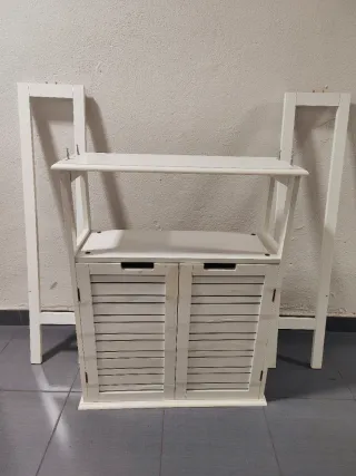 Estantería de madera con un diseño de especiero. Tiene las patas desarmadas que son las que aparecen a los laterales de la imagen. Las compuertas están sostenidas con cinta adhesiva para que no se abran ni se rallen (ver imagen). Tiene su uso pero está en buen estado. - Acabado en color blanco. - Estructura de madera.