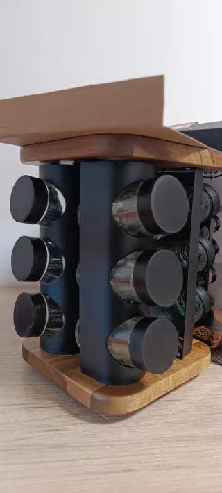 Especiero giratorio con base de madera y estructura negra. Incluye 12 frascos para especias. - Diseño moderno y funcional. - Base de madera. - Estructura giratoria. Precio negociable