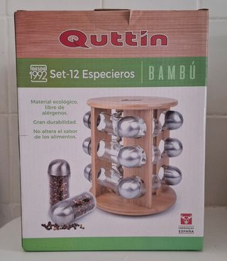 Especiero giratorio de bambú de la marca Quitín, completamente nuevo y sin estrenar. Ideal para organizar tus especias en la cocina. - Capacidad para 12 especias. - Material ecológico y libre de alérgenos. - Base giratoria para fácil acceso. - Botes de cristal con tapas metálicas. - Diseño elegante y funcional.