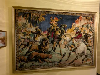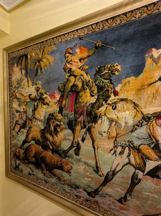 Este tapiz antiguo es una pieza decorativa que representa una escena de caza con camellos y leones. - Diseño intrincado con detalles de palmeras y montañas. - Marco dorado que realza la obra. - Tejido de alta calidad.