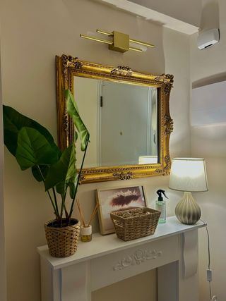 Elegante espejo con marco de forja en acabado dorado. Su diseño aporta un toque clásico y sofisticado. - Marco con detalles decorativos. - Base con soportes curvos.