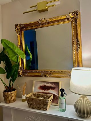 Elegante espejo con un marco dorado y detalles ornamentales. Un toque clásico para cualquier espacio. - Marco con diseño tallado. - Cristal reflectante.