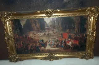 Este es un cuadro antiguo con una escena colorida y detallada. El marco es de color dorado y complementa la obra. - Marco dorado. - Pintura multicolor.