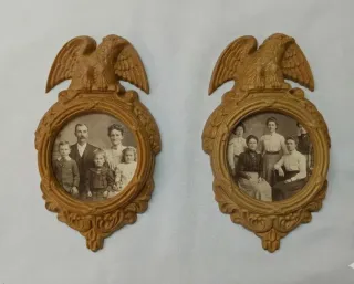 Dos marcos decorativos diseño clásico: águila explayada en parte superior y detalles de guirnaldas de hojas laurel. Años 70 De resina rígida de alta calidad (tipo Syroco), muy ligera pero con aspecto de madera tallada tono ocre/dorado envejecido ✨ Perfectos para colocar🪞espejos convexos (tipo ojo de buey) 🎞️ fotos antiguas o 🖼️ decoración de pared Ideal para amantes de estilo vintage, Neoclásico, Federal, Regency, Imperial En muy buen estado, sin grietas. Listos para ser restaurados, pintados o usados tal cual (no incluyen cristal) 📐 Medidas - 18'6 cm alto - 11'3 cm ancho - 2'4 cm fondo - diámetro círculo interior 5'2 cm
