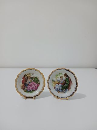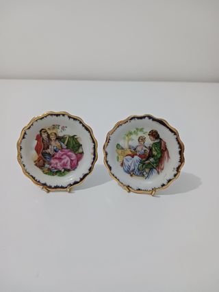 Adornos de porcelana. Dos platos con figuras decorativas francesas con sus bases doradas. Antiguos. Medidas : Diámetro de los platos : 5 cm.