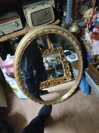 Antiguo espejo con marco labrado y de color dorado, forma ovalada.