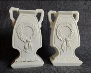 Pareja de antiguos jarrones estilo Imperio en cerámica con decoración dorada en un lado. las dimensiones se pueden ver en las fotos, están en buen estado pero el dorado está algo gastado, tienen algún pelo y un pequeño cosque en la parte de atrás (ver fotos). Probablemente eran la guarnición de un reloj