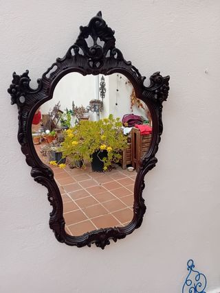 Precioso espejo vintage con marco de madera y metal. Es de estilo rococó, con un diseño elegante y ornamentado. Ideal para añadir un toque clásico a cualquier habitación. - Marco de madera tallada. - Espejo de cristal. - Diseño antiguo.