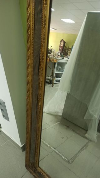 Espejo muy antiguo en madera dorada. Medidas: 140 cm de alto y 40 cm de ancho.