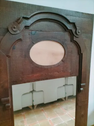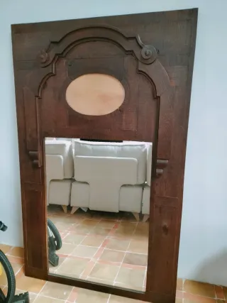 Elegante espejo de pie con un marco fabricado a partir de una puerta antigua de madera tallada a mano. Material: Madera natural. Estilo: Rústico o clásico, con detalles tallados y acabado barnizado. Diseño: Cuenta con una forma arqueada en la parte superior y un espacio para espejo en la sección inferior. Uso: Ideal para decoración de interiores en vestíbulos o salas de estar. No se envía. Recogida en el domicilio. Medidas 160 x 100.