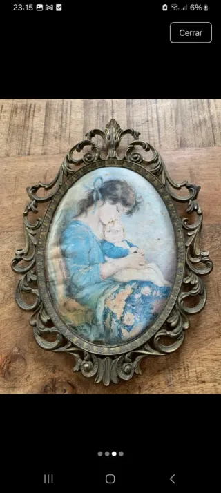 Cuadro antiguo latón pintado a mano madre e hijo