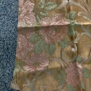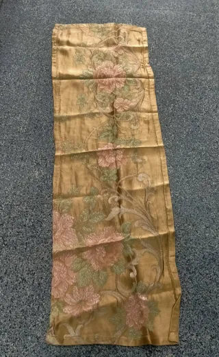 camino de mesa muy antiguo de seda con un diseño floral bordado,mide 1,20 x 39,color oro y estampado verde y rosa