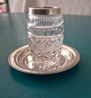 ANTIGUO PALILLERO CRISTAL TALLADO Y PLATA