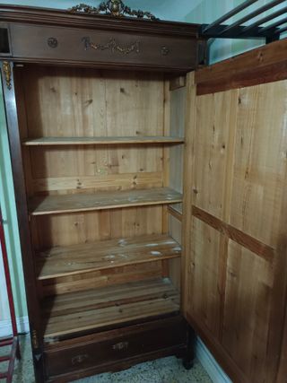 ¡ÚLTIMA OPORTUNIDAD! ULTIMA OPORTUNIDAD MARTES 17 MARZO ‼️‼️ BAJADA DE PRECIO Armario antiguo de estilo vintage, con un diseño grande y elegante. - Acabado en madera oscura. - Detalles dorados en la parte superior y tiradores. - Puerta con espejo. - Cajón inferior Ubicación: zona de la Magdalena. Planta segunda sin ascensor. Ayudamos nosotros a bajar cualquier mueble. Se puede sacar cajones y baldas. Tiene alguna marca de infestaciones antiguas de carcoma. En buen estado.