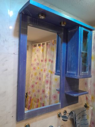 Mueble del baño colgante con espejo y luz integrado. Color azul. Tiene tres estanterías dos de ellas tapadas mediante una puerta.