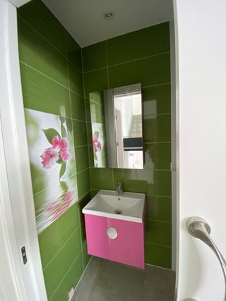 Mueble de baño con espejo y acabados en rosa y verde. - Diseño moderno. - Incluye espejo que mide 50 de ancho 75 de alto y de fondo 15 cm.
