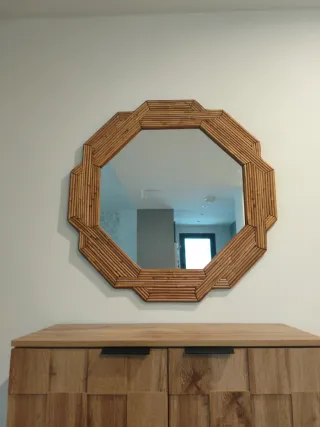 Vendo espejo de pared DKD Home Decor, con marco de ratán natural en color marrón. Medidas: 80 x 80 cm. Exterior. 55 x 55 cm. Interior. Está en perfecto estado, sin golpes ni desperfectos. Es un espejo decorativo ideal para salón, dormitorio, recibidor o espacios con estilo boho, natural o mediterráneo. Aporta mucha luz y calidez a la estancia. Producto descatalogado, difícil de encontrar actualmente.