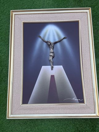 Precioso cuadro con la imagen de Cristo crucificado. Presenta un marco con detalles en beige y dorado. - Figura de Cristo en relieve. - Iluminación dramática. - Marco con textura de tela.
