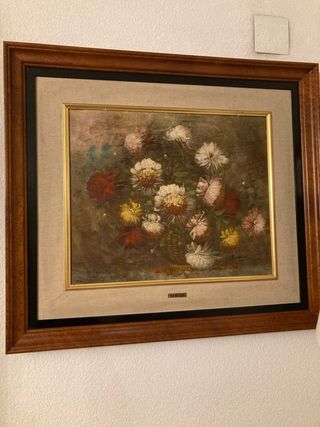 Precioso cuadro pintado al óleo, con una composición floral y un jarrón. - Técnica: Óleo. - Motivo: Flores y jarrón. - Colores: Tonos rosas, blancos y rojos en las flores, jarrón negro.