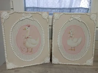 Enamórate de esta preciosa pareja de cuadros patitos en tonos beige blancos y rosados una pieza única para darle un toque a cualquier rincón realizados de manera artesanal en madera maciza con molduras decorativas y detalle lazo. Precio por pareja.33 por 26.