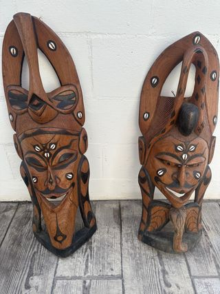 Conjunto de dos máscaras decorativas talladas a mano en madera, 80x30 cm. Cada pieza presenta un diseño tribal único con detalles en negro y adornos. - Hechas de madera. - Colores: marrón y negro. - Incluye dos máscaras.