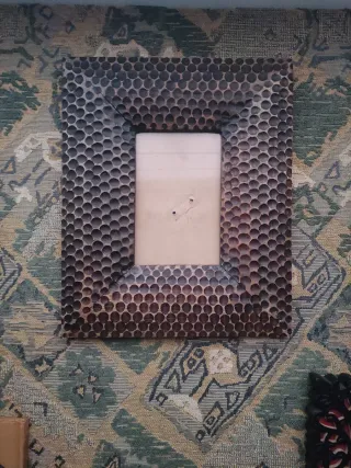 Marco decorativo para pared con un diseño texturizado efecto panal de la marca Zara Home. - Acabado en madera con detalles en relieve. - Medidas aprox.: 24x(h)29cm/espesor 2cm. - Hueco interior/14x9 cm. **Antes era un Marco de fotos, se ha retirado soporte y se ha puesto herraje para colgar a pared.