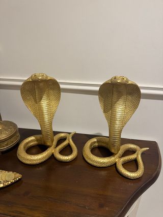 Elegante par de figuras decorativas de serpientes. - Diseño detallado de cobras. - Acabado metálico brillante.