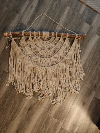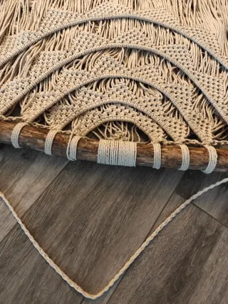 Tapiz de macramé hecho a mano, perfecto para decorar cualquier espacio. - Medidas: 110x120cm. - Colgante de madera. - Diseño bohemio y artesanal.
