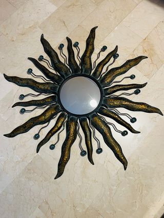 Precioso espejo con un marco de metal intrincado y decorativo. - Diseño único con forma de sol. - Detalles en espiral y líneas finas. - Adornos de mariposas. - Marco con acabado en tonos dorados y marrones.