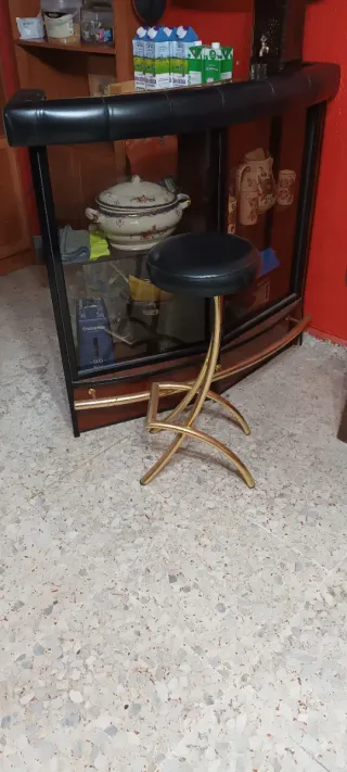 Conjunto de barra de bar con dos taburetes. - Diseño moderno y elegante. - Acabado en piel negra y metal dorado. - Superficie de cristal.