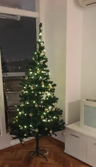 Árbol de Navidad artificial de 180cm decorado con esferas doradas y luces cálidas. - Adornos de color dorado y purpurina dorada. - Luces LED integradas (sin pilas)