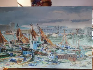 Preciosa pintura al óleo del artista Salas Cano. Representa un paisaje portuario con barcas de pescadores . Medidas 146 x 97 cm - Firmada por el autor. - Marco dorado incluido.