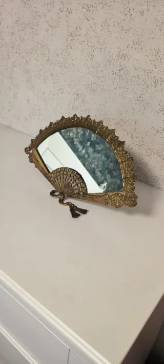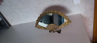 Elegante espejo con un diseño de abanico, perfecto para añadir un toque de distinción a cualquier espacio. - Marco con detalles ornamentales. - Base con adorno de abanico y borlas.