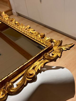 Elegante espejo antiguo con un marco detallado que combina madera y detalles dorados. Ideal para añadir un toque clásico a cualquier estancia. - Marco con ornamentación. - Acabado en tonos madera y dorado.