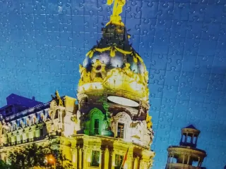 Puzzle de una vista nocturna de Madrid, con edificios iluminados y estelas de luz de coches. - Representa una escena urbana icónica. - Tonos azules y dorados predominantes.
