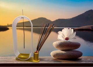 Elegante soporte para varillas de incienso con un diseño moderno. - Base y detalles en dorado. - Estructura principal en blanco. - Se hace del color que se desee