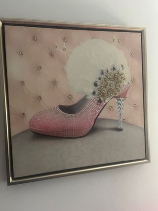 Bonito cuadro decorativo con un zapato de tacón. - Diseño elegante. - Tonos rosas y dorados.