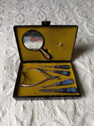 Estuche de manicura vintage con varios utensilios y un pequeño espejo. - Incluye cortaúñas, limas y otros accesorios. - Forro interior de terciopelo dorado.