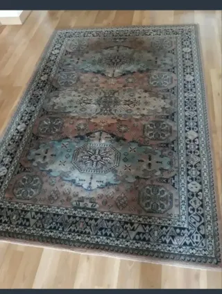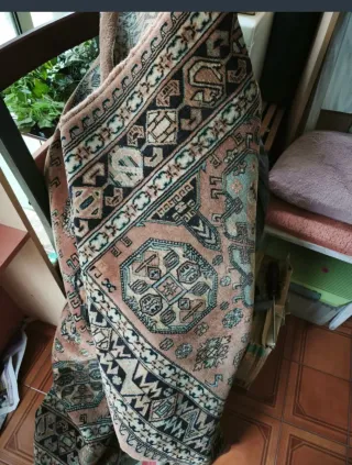 Alfombra de tela con un diseño llamativo y colores vibrantes. - Diseño geométrico. - Bordes con flecos. - Tacto agradable. Medirá unos 2 metros o mas . Entrega en mano en Vilareal,Betxi,Nules o cerca.