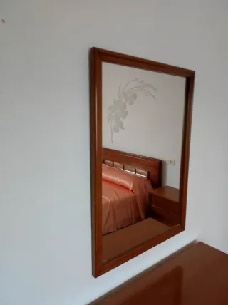 Espejo de pared con marco de madera robusto y de gran calidad. Pieza sólida, decorativa y muy funcional, perfecta para dar amplitud y luz a cualquier estancia. El marco tiene un diseño clásico atemporal que encaja tanto en dormitorios como en recibidores, pasillos o pisos de alquiler. Incluye detalle floral grabado en el cristal que le aporta un toque elegante y diferente sin recargar. ✔ Madera fuerte y resistente ✔ Cristal en buen estado ✔ Listo para colgar ✔ Aporta sensación de espacio y luminosidad Ideal para quien busca un espejo grande, duradero y con presencia, no de los modelos ligeros y modernos de baja calidad. Se vende por