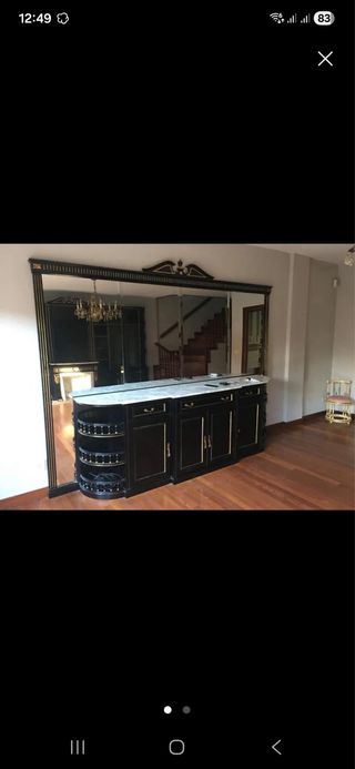 Espejo mural biselado de gran tamaño, con marco de madera maciza en negro y detalles dorados. Pieza elegante y de alta calidad, ideal para casas grandes, salones, negocios, hoteles, restaurantes o locales con estilo. Se vende completo y en perfecto estado. Está desmontado para facilitar el transporte. ACLARACIÓN IMPORTANTE: La foto donde aparece sin el trinchante es solo una sugerencia decorativa generada con IA. El espejo NO incluye trinchante ni lleva espejo por detrás del mismo Se vende a muy buen precio por falta de espacio.