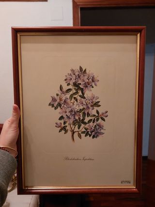 Cuadros con laminas de detalles flores. Marcos en negro con detalles dorados los pequeños. De cristal. Precio por unidad: pequeños 4€ marxo 30x25cm / interior 22,5x17,5cm grande 6€ marco 56x46cm/interior del paspartú 39x29cm/ sin paspartú 49x39cm conjunto 20€